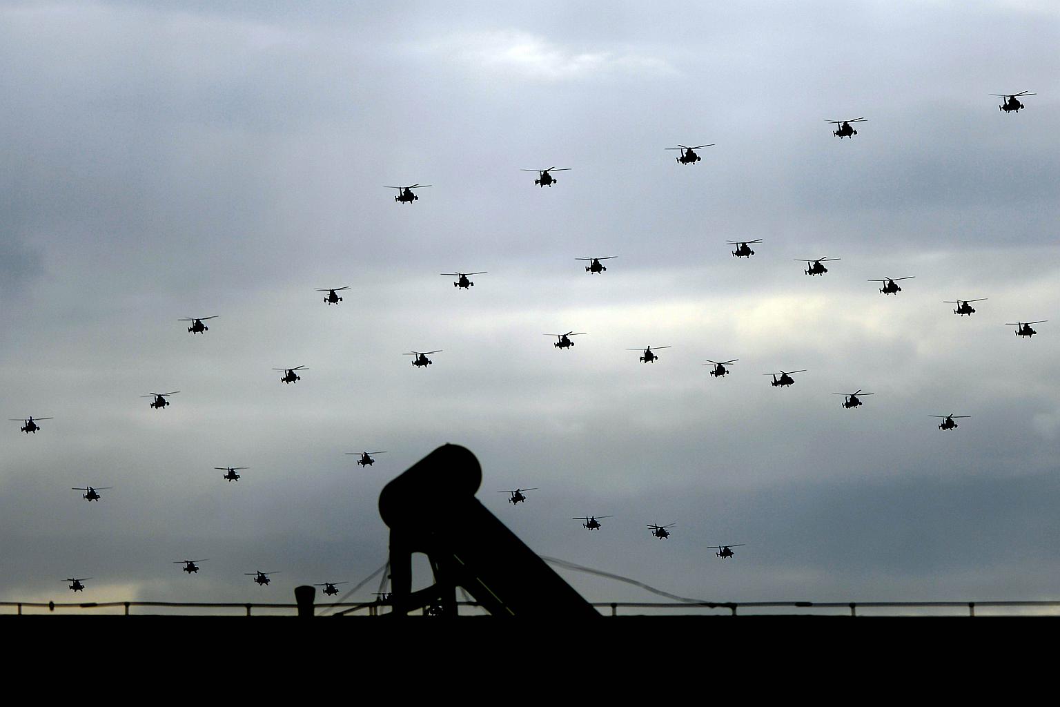 Chinese military helicopters take part in a rehearsal ahead of a military parade to mark the 70th anniversary of the end of World War II, in Beijing on Aug 23, 2015.