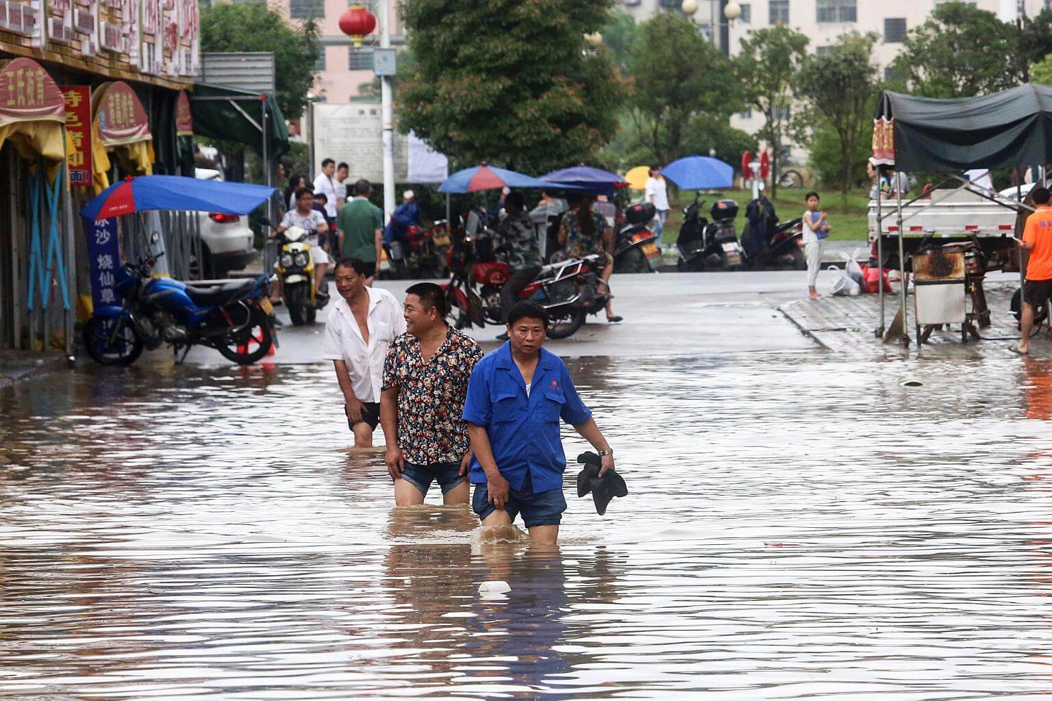 People walking along a flooded street in Loudi, Hunan province, on July 2, 2017.