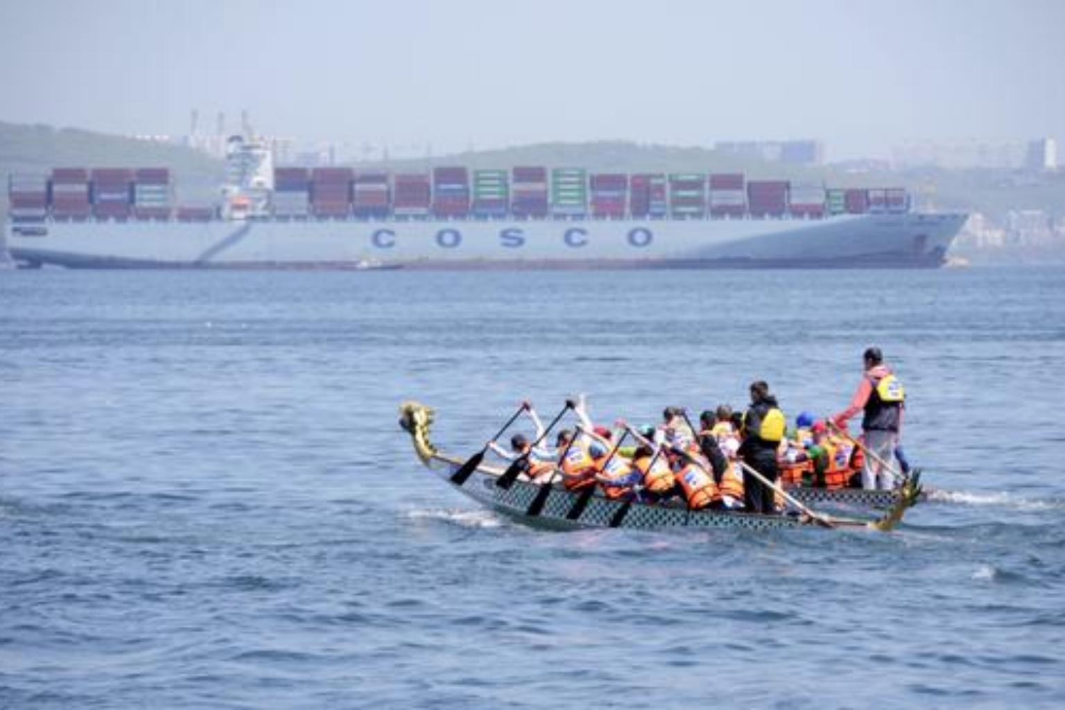 Athletes competing in a Dragon boat pulling race in the Sea of Japan waters, with the COSCO Yantian cargo ship seen in the background, near the far eastern port of Vladivostok, Russia,on May 23, 2015.