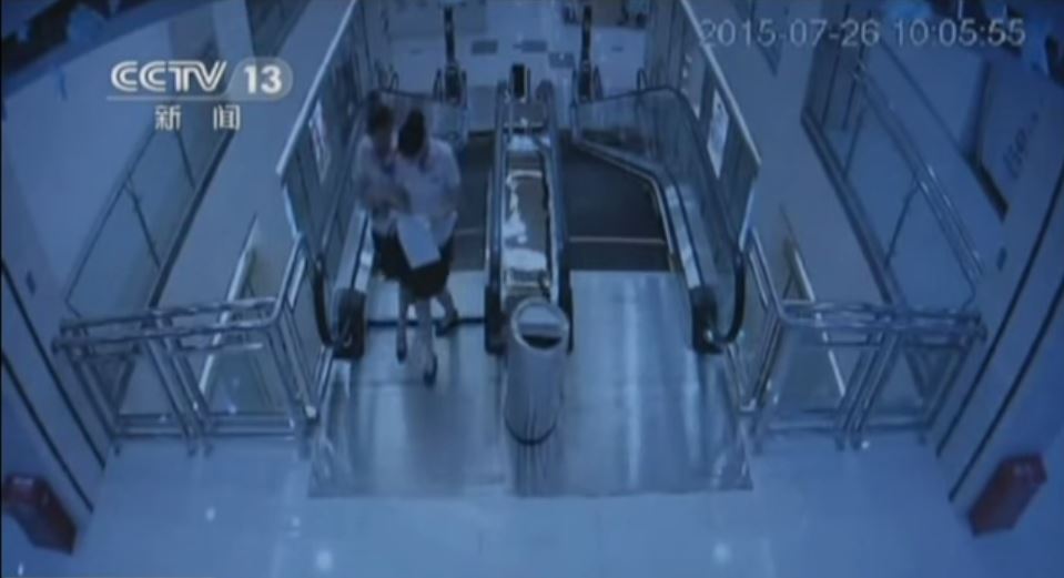China's state broadcaster CCTV released a two-minute video that captures how a female mall employee had travelled down the escalator from the seventh to the sixth floor.