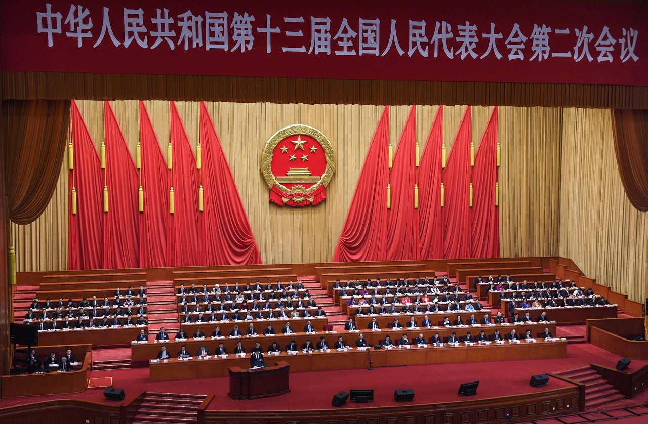 A photo taken on March 8, 2019, shows the second plenary session of the National People's Congress at the Great Hall of the People in Beijing.