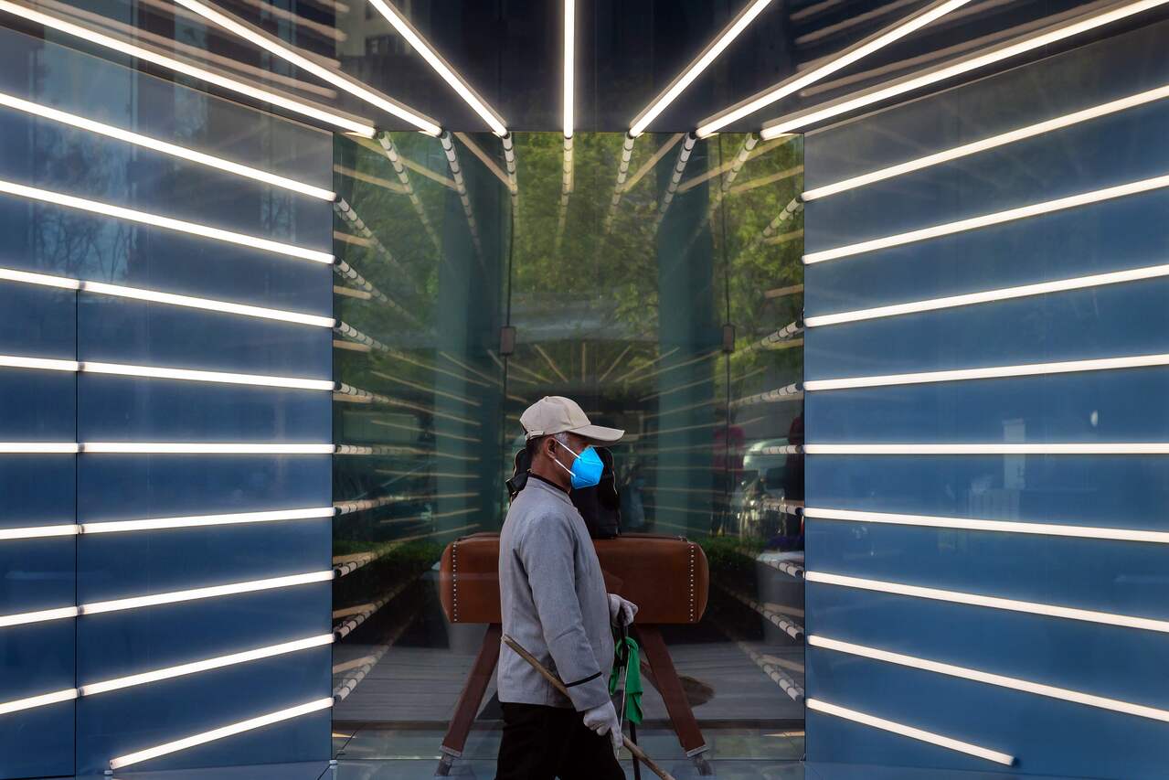 A worker walks outside a shopping mall in Beijing, on April 23, 2020.