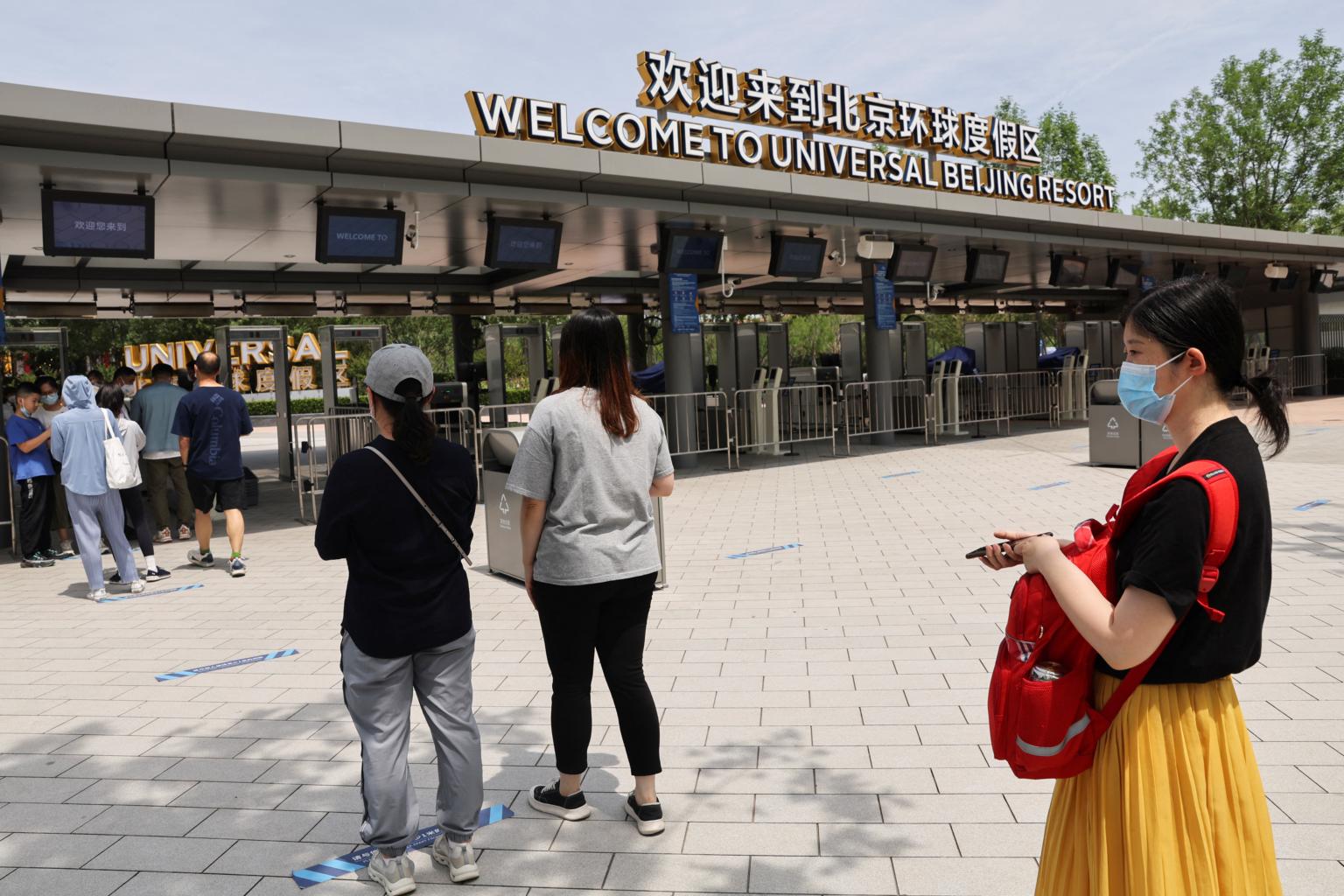 Tourists practice social distancing as they line up to enter the Universal Beijing Resort in Beijing, on June 25, 2022.