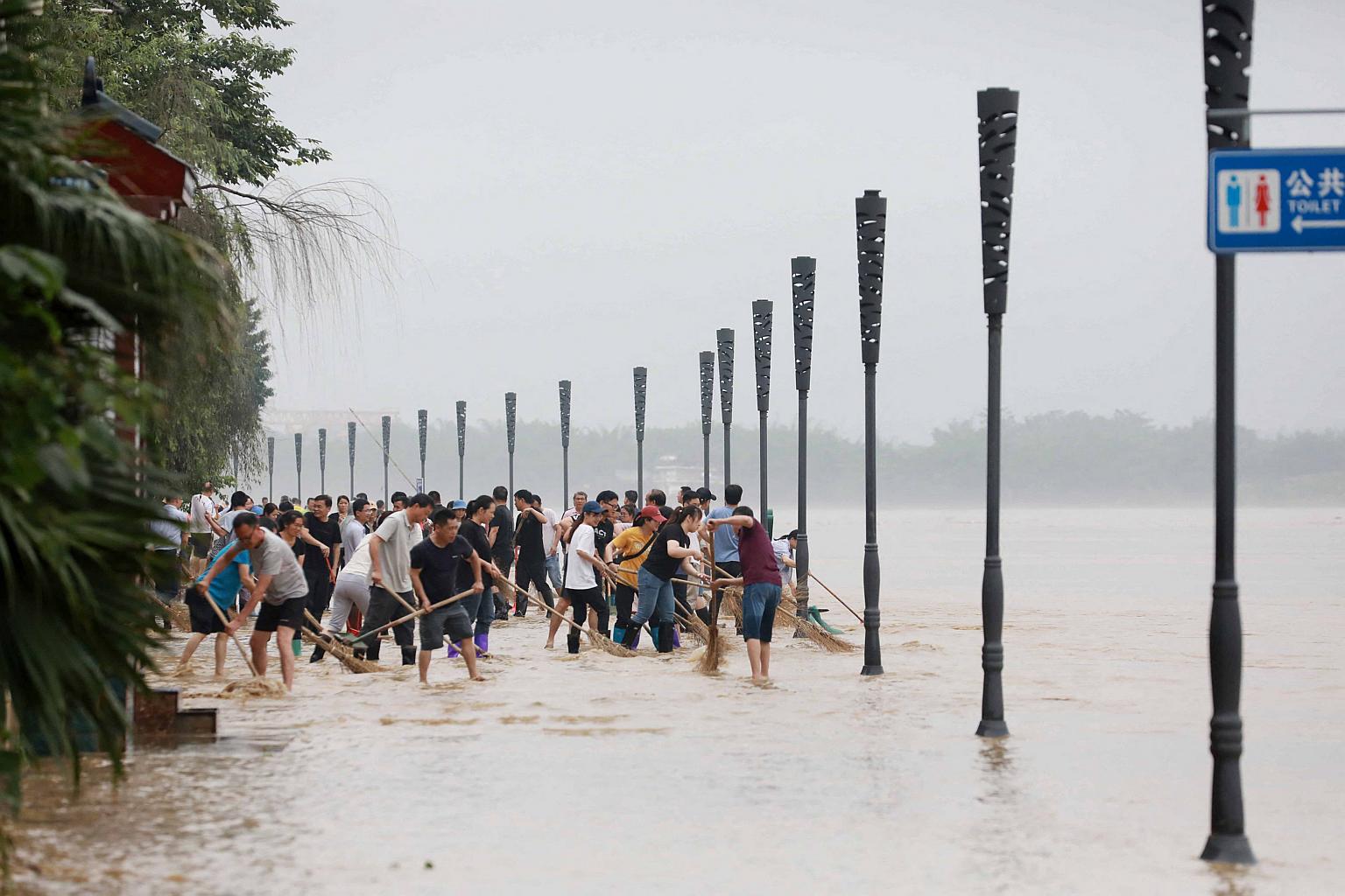People clearing a flooded street caused by heavy rain in Rongan, China's southern Guangxi region, on June 5, 2022.