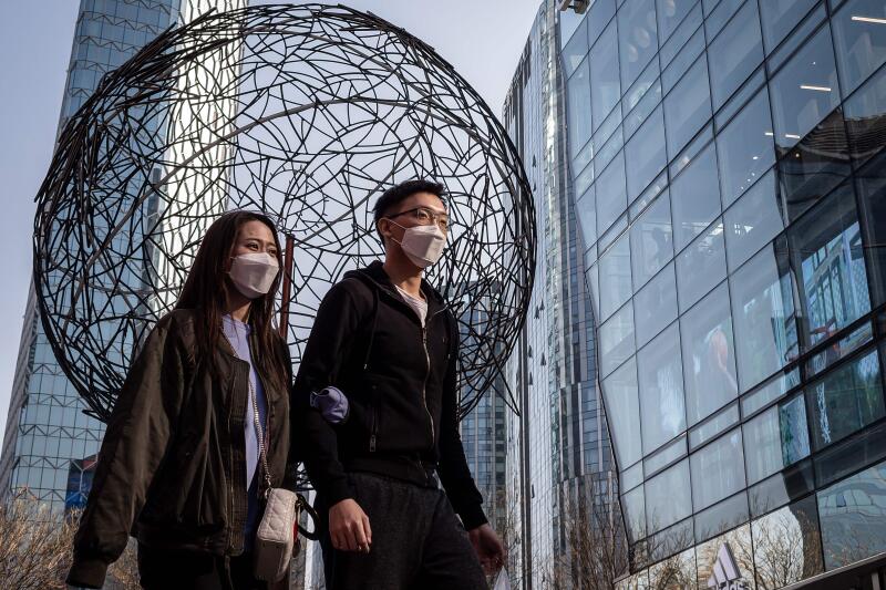 A woman and a man wearing face masks as a preventive measure against the coronavirus walk outside a shopping mall in Beijing, on March 11, 2020.