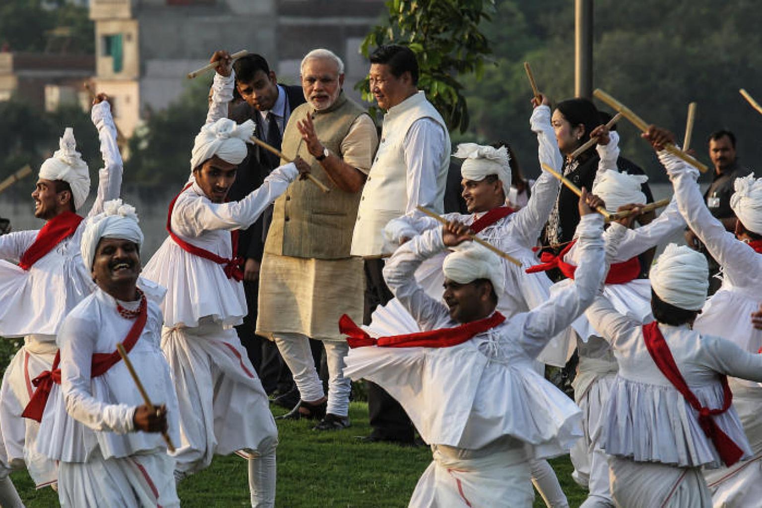 Indian Prime Minister Narendra Modi (centre left) escorts Chinese President Xi Jinping through a group of dancers in Ahmedabad, India, on Sept 17, 2014.