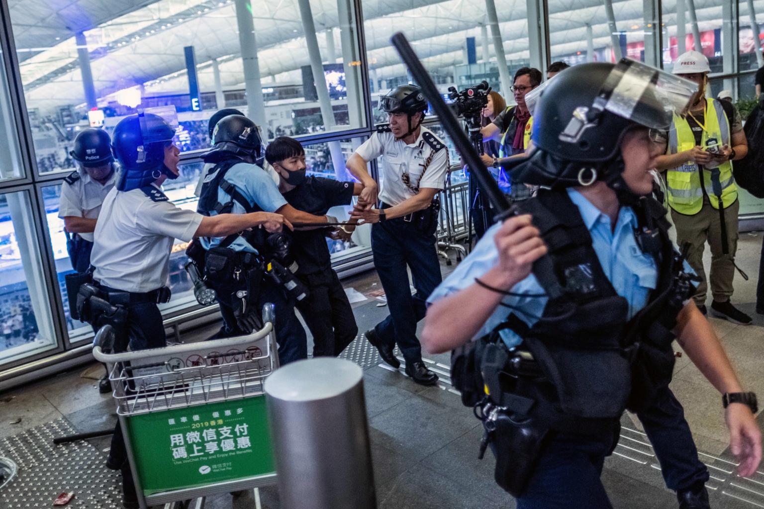 In a photo taken on Aug 13, 2019, a protestor is taken into custody at the Hong Kong International Airport.