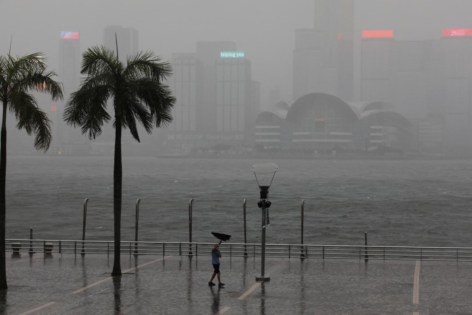 A man walking with his umbrella amid a typhoon warning in Hong Kong on July 1, 2022.