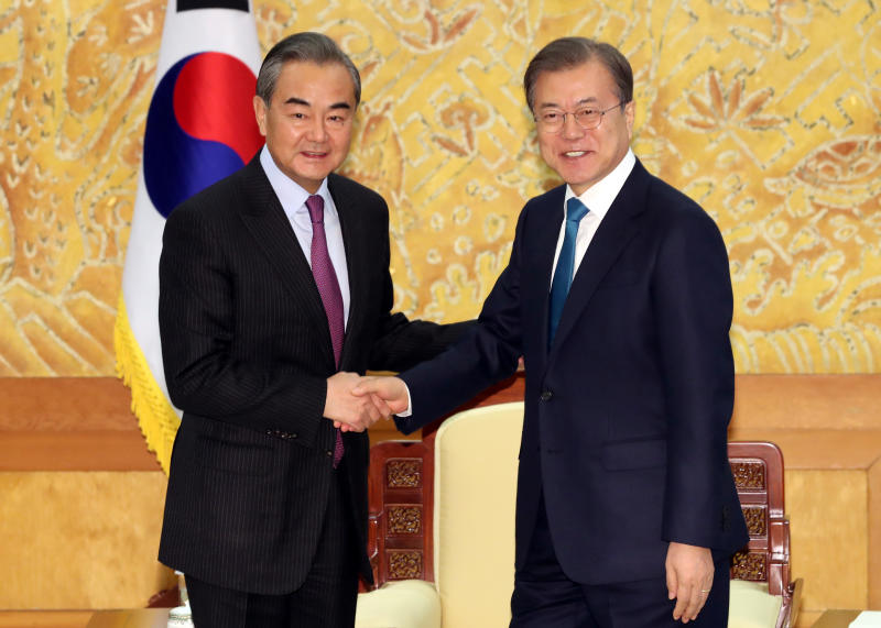 Chinese Foreign Minister Wang Yi meets South Korean President Moon Jae-in at the Presidential Blue House in Seoul on Dec 5, 2019.