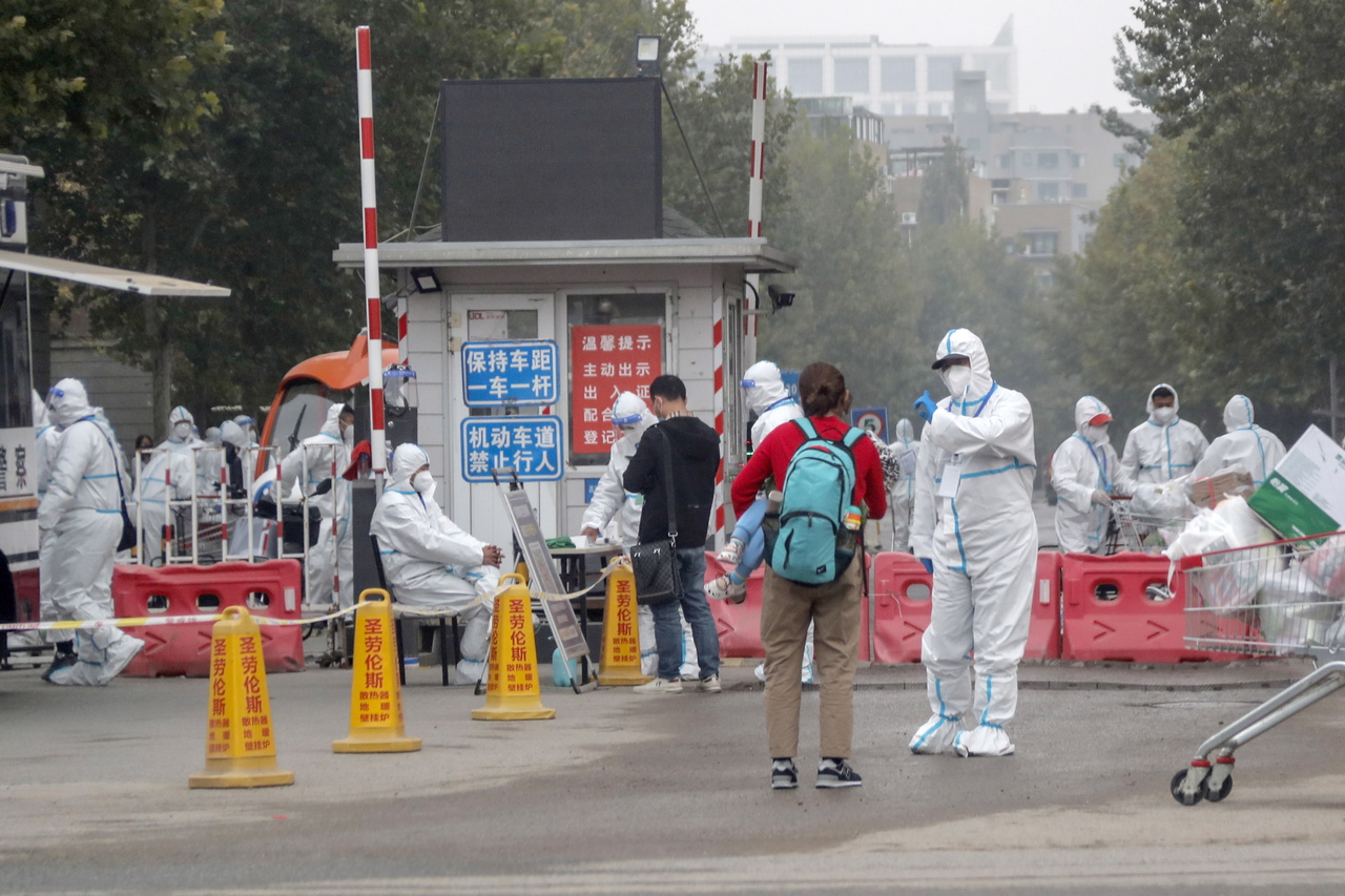 Epidemic prevention and control staff stand guard at a neighbourhood under lockdown at the Hongfuyuan residential community in Changping district of Beijing on Oct 25, 2021.