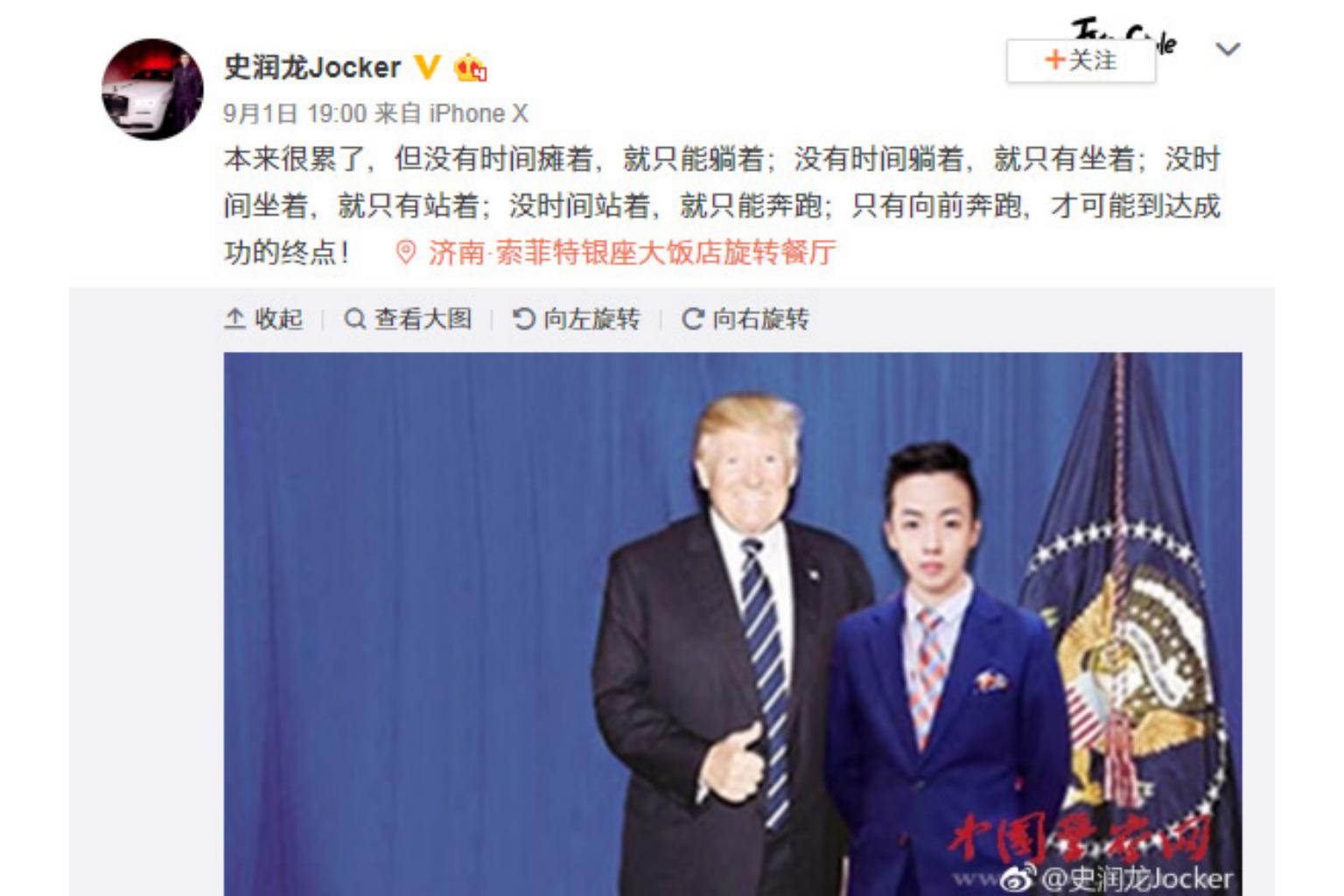 A screengrab of Shi Runlong's Weibo page, with him pictured as posing with US President Donald Trump.