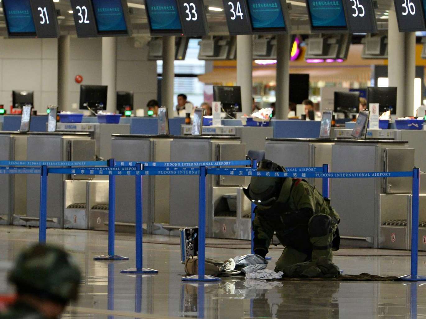 A paramilitary bomb disposal expert inspects a luggage left near a check-in counter after an explosion at Pudong Airport in Shanghai, on June 12, 2016.