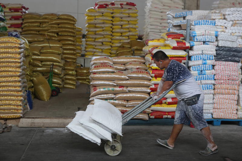 A Chinese man pushes a trolley past bags of soybean in a grain wholesale market in Beijing, China, on July 31, 2018.