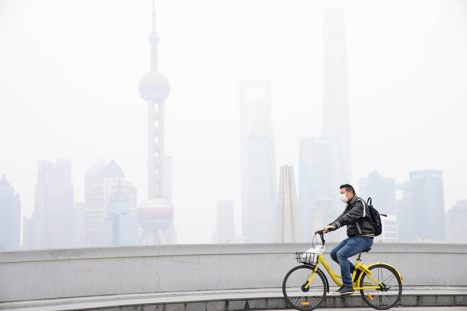 A man wears a face mask while riding a bicycle on a polluted day in Shanghai, China, on Nov 22.