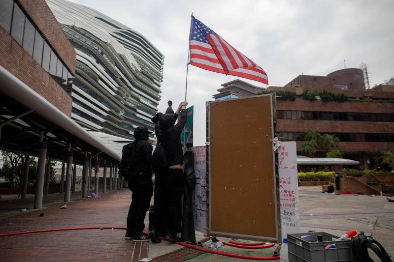 Protesters display a US flag inside Polytechnic University of Hong Kong on Nov 20, 2019.