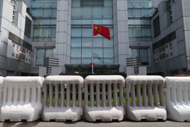 The Chinese flag fluttering behind barriers outside the China Liaison Office in Hong Kong on Aug 31, 2019.