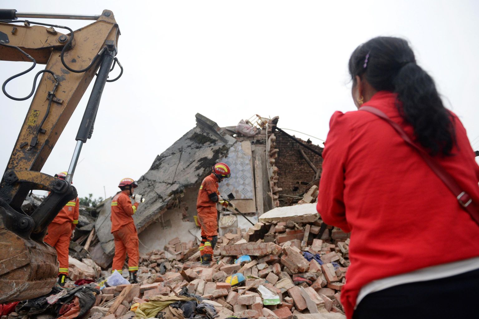 A woman stands near rescue workers searching for survivors in the rubble after the Sichuan earthquake, on June 18, 2019.