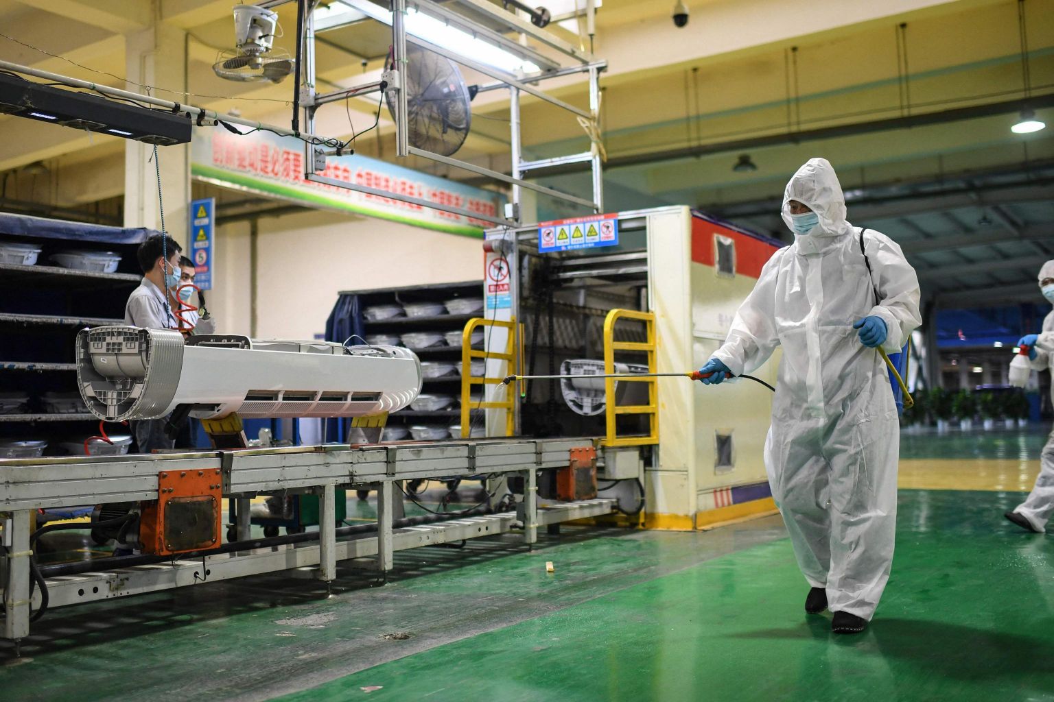 An employee wearing personal protective equipment spraying disinfectant as part of Covid-19 measures at a factory in Wuhan on Aug 9, 2021.