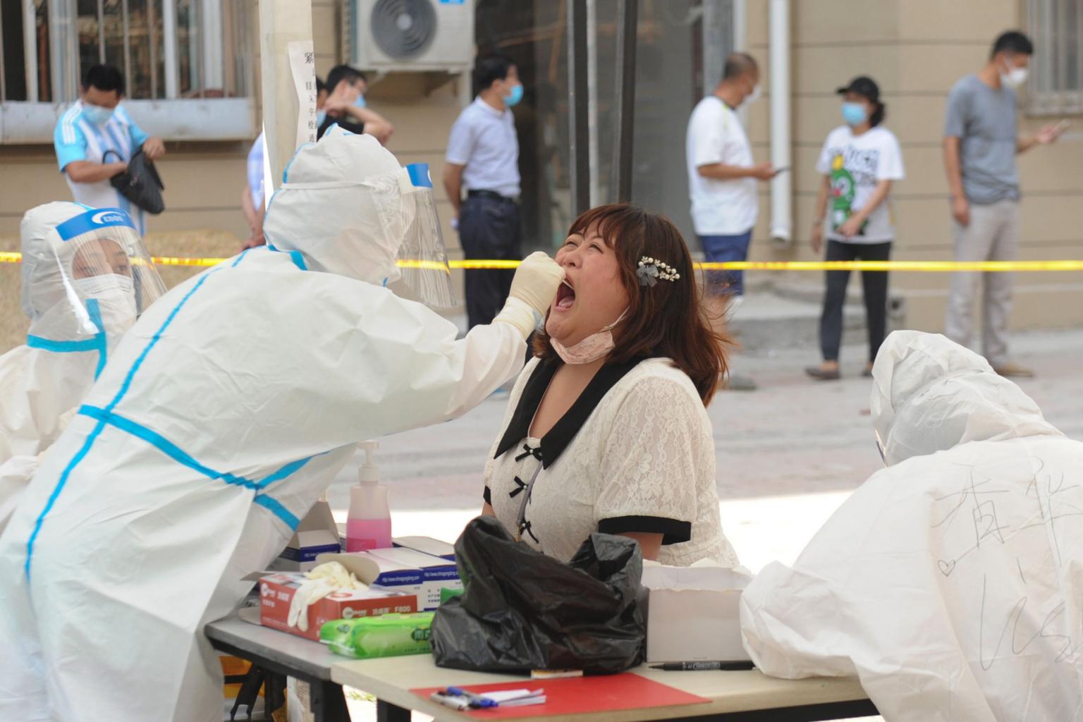 A health worker carries out a coronavirus test on a resident in Dalian, China, on July 28, 2020.