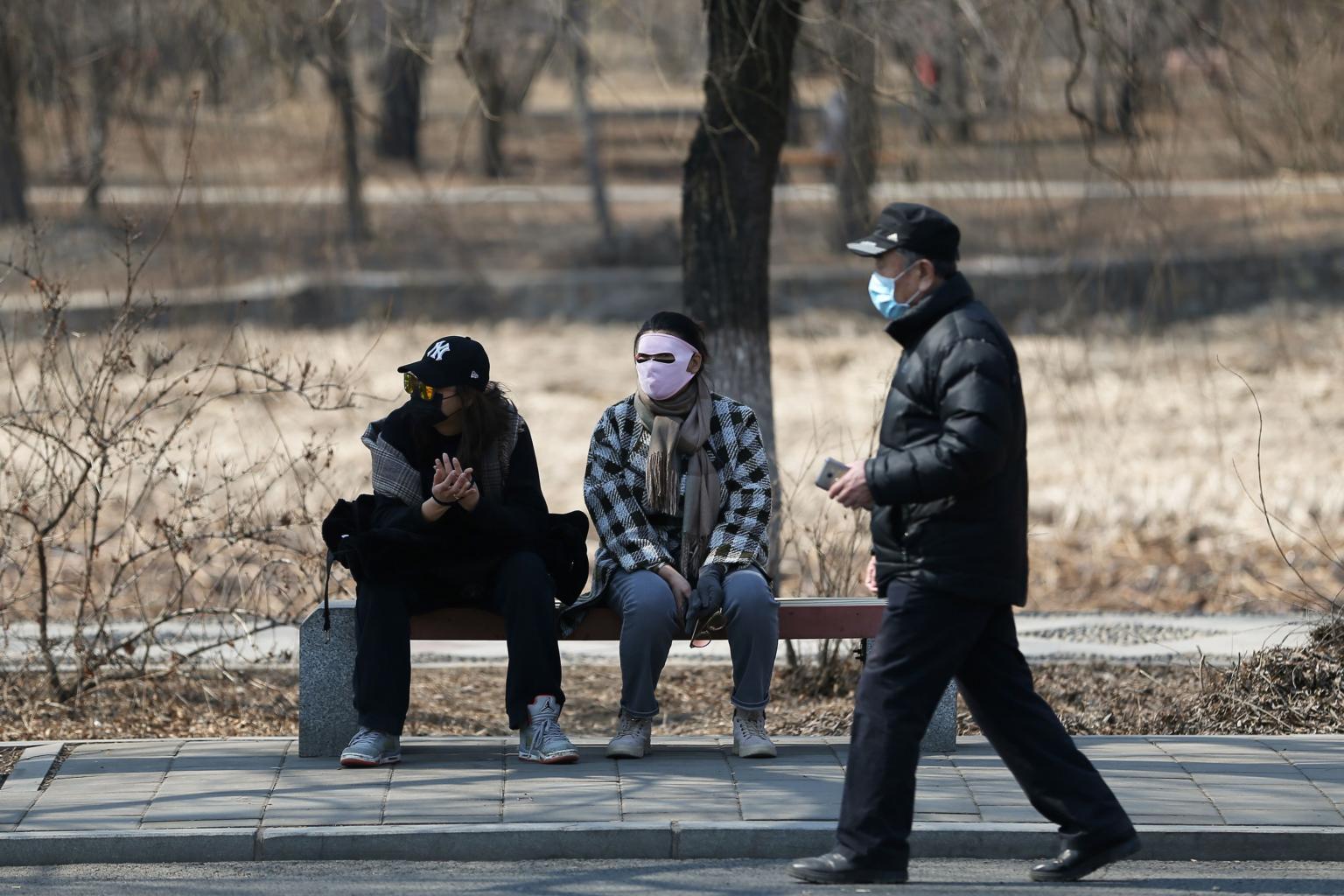 People rest at a park in Shenyang, China, on March 22, 2020.