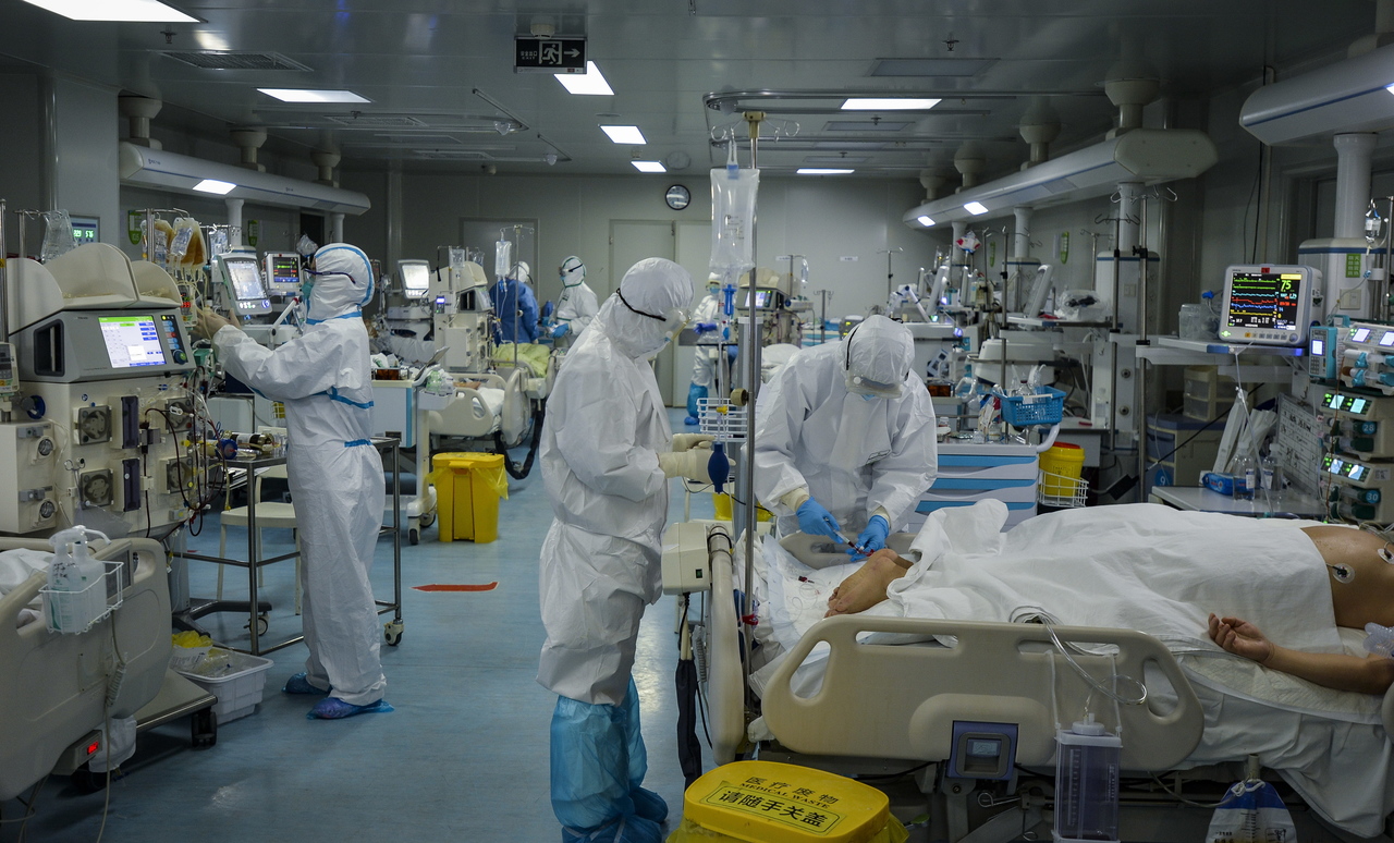 Medical personnel work in the intensive care unit of a hospital designated for coronavirus patients in Wuhan, Hubei province, China, on Feb 24, 2020.