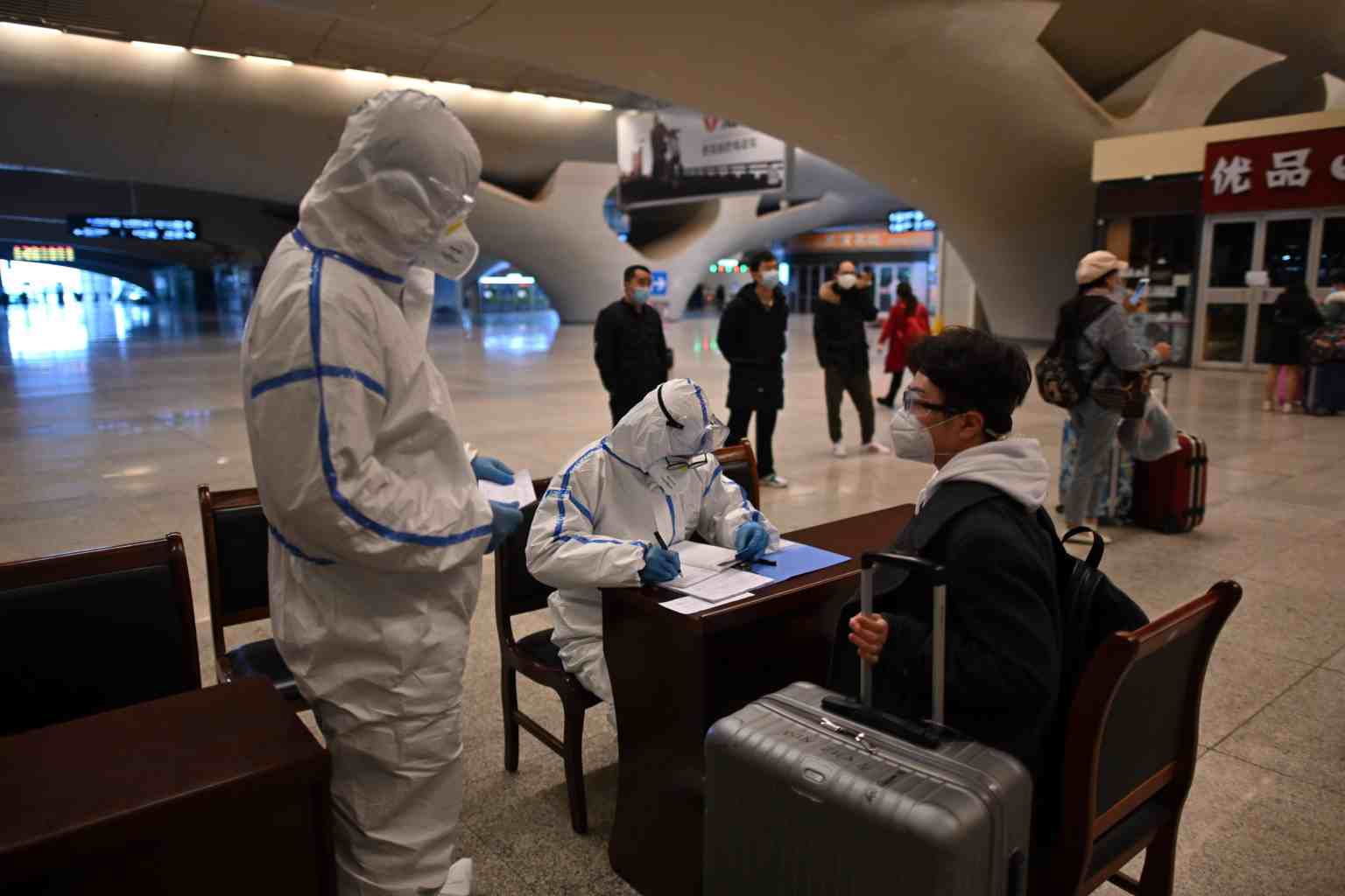 A worker in protective gear checks the information of passengers arriving at the railway station in Wuhan, China's central Hubei province, on March 28, 2020.