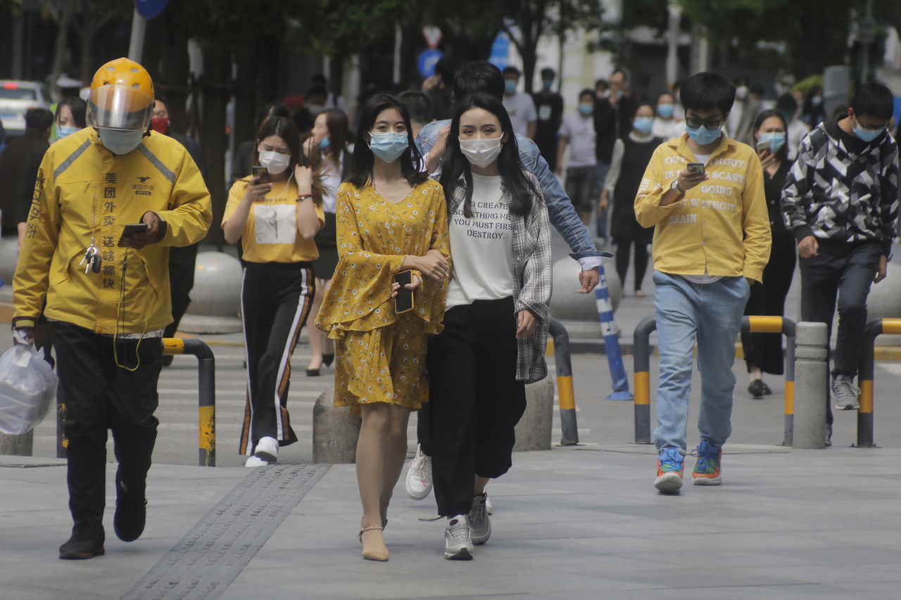 People wearing face masks walk outside a shopping mall in Beijing on May 11, 2020.