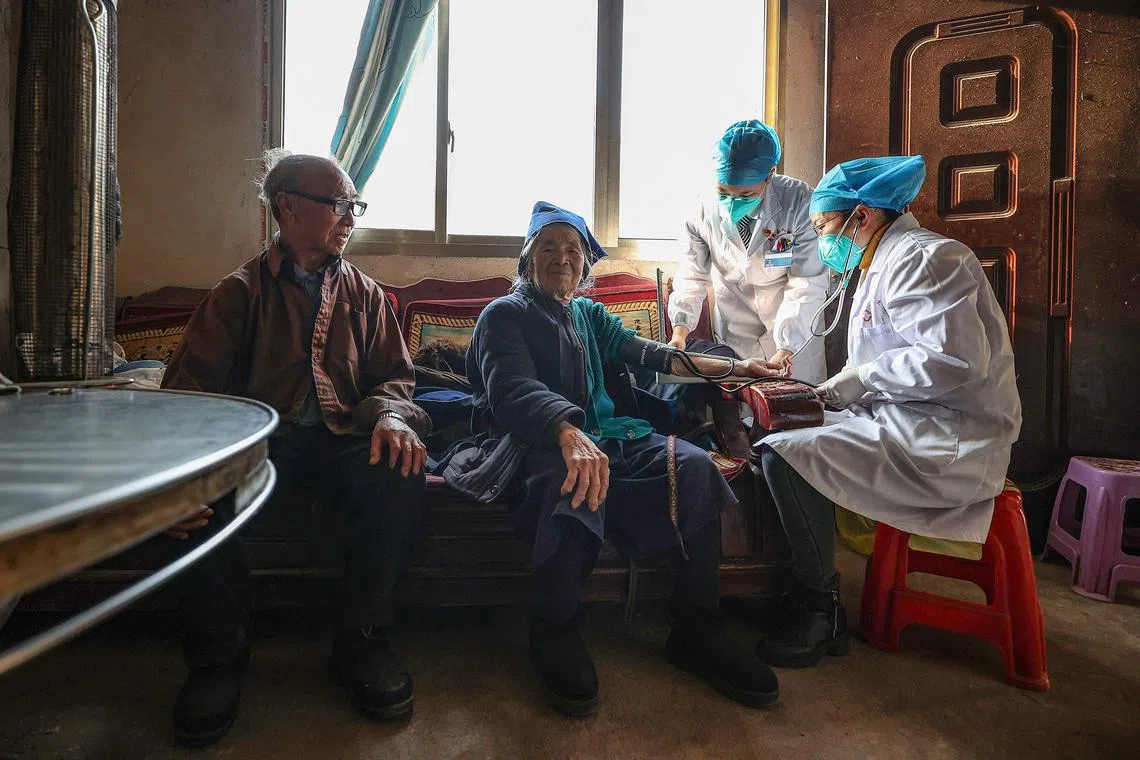 An elderly resident receiving a health check before getting a Covid-19 vaccine at her home in Danzhai county, in the Chinese province of Guizhou, on Dec 12.