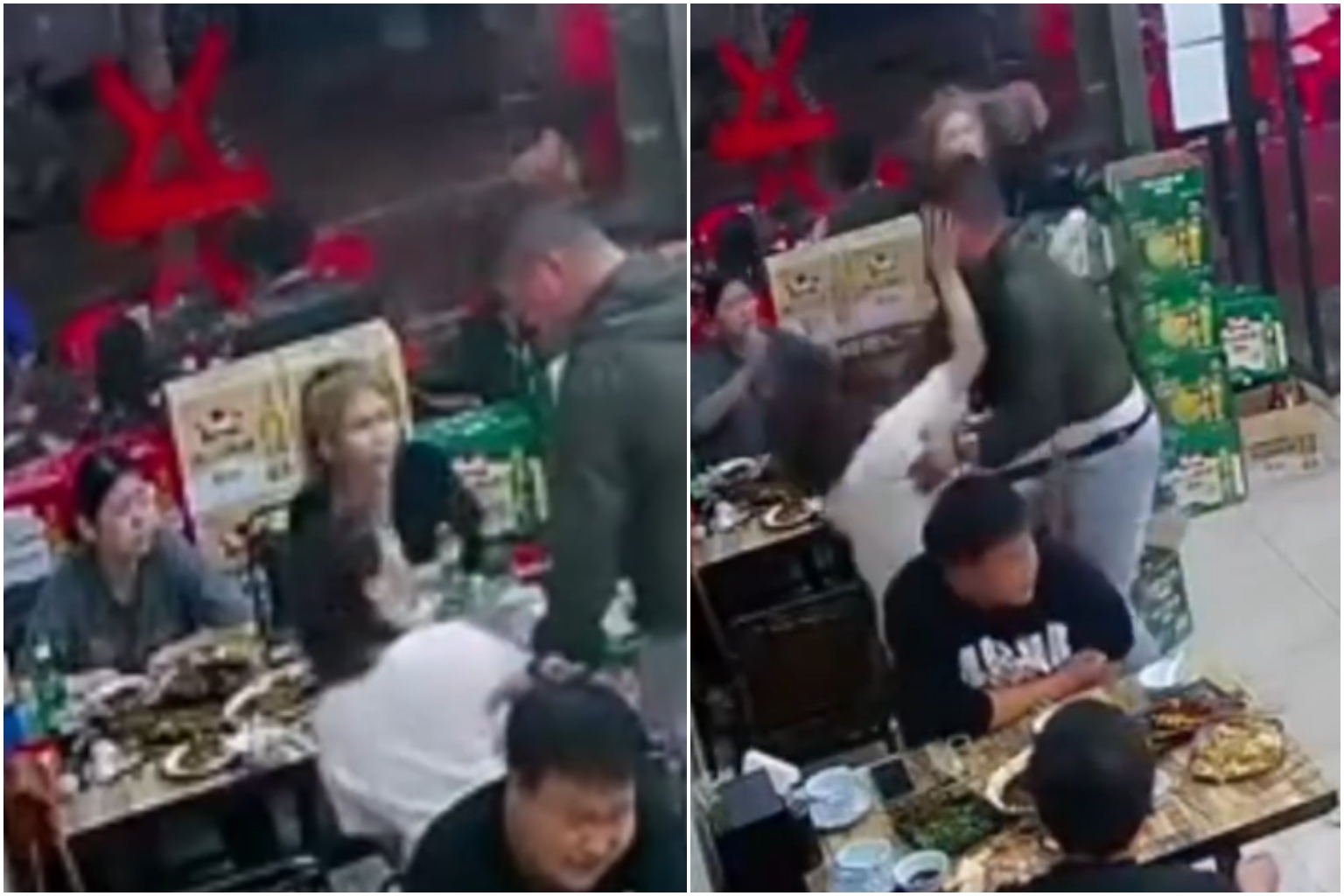 After the woman pushes him away, the man strikes her before others drag her outside and deal a barrage of blows as she lies on the ground. Another woman is also knocked to the floor.