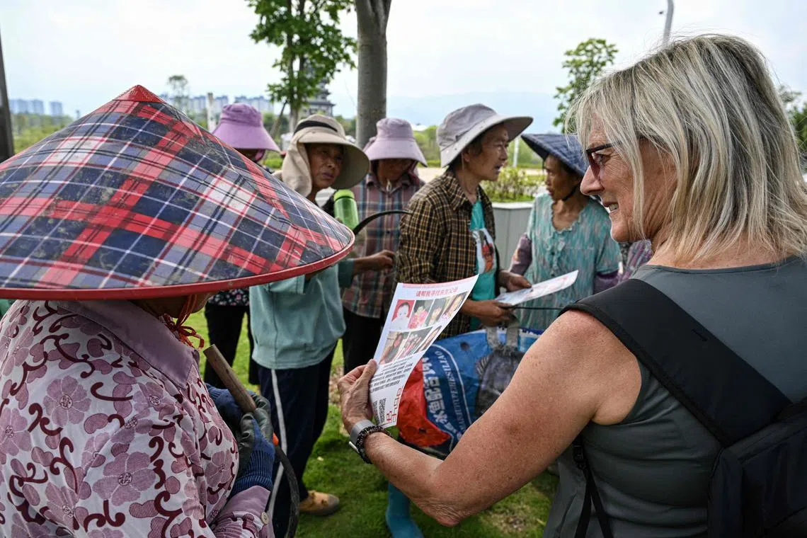 Ms Corinne Wilson (right) walking on a street as she holds fliers to look for her adopted daughter Loulee's biological parents in Dianjiang county.
