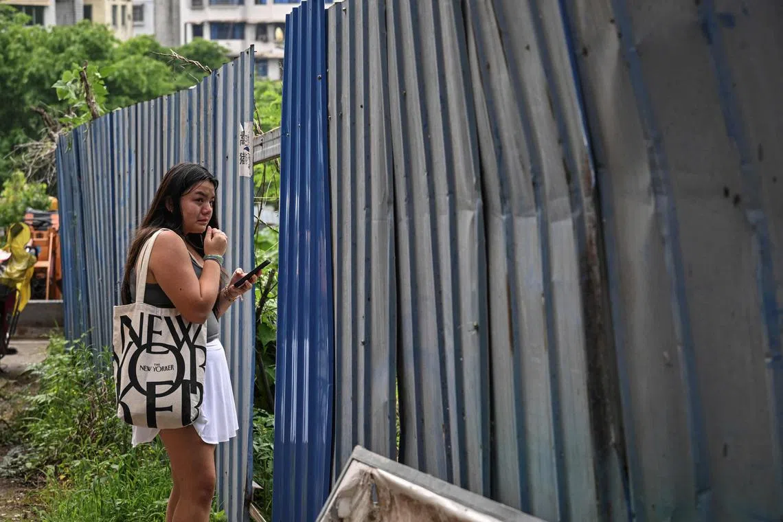 Ms Corinne Wilson sticking a flier in the hope of finding her adopted daughter Loulee’s biological parents on a faded billboard with a slogan that reads: “A daughter is like a slice of heaven, she’ll take good care of you when you’re old”.