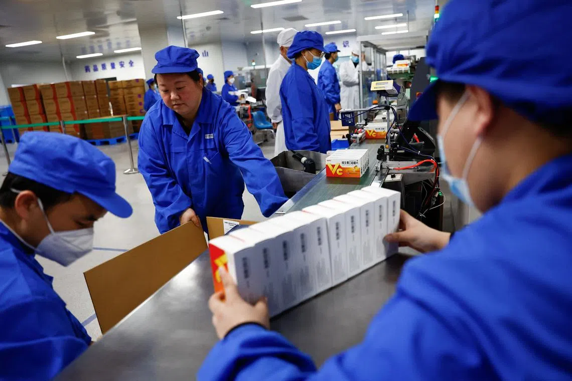 Employees work on packaging Vitamin C tablets at a Youcare workshop in Beijing, on Jan 10, 2023.