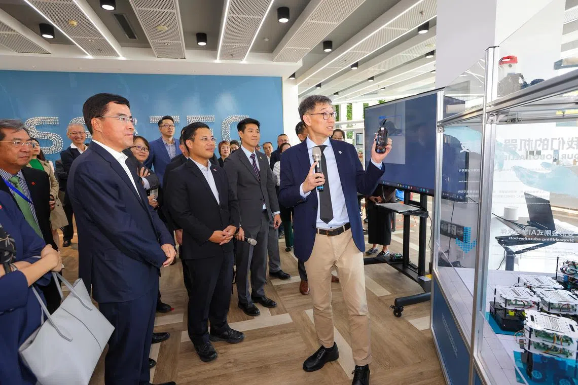 SUTD President Phoon Kok Kwang (right) presenting a smart robot that inspects ceilings to National Development Minister Desmond Lee and his delegation at the SUTD Eco-City Research and Innovation Centre in Tianjin, which was launched on Sept 27.