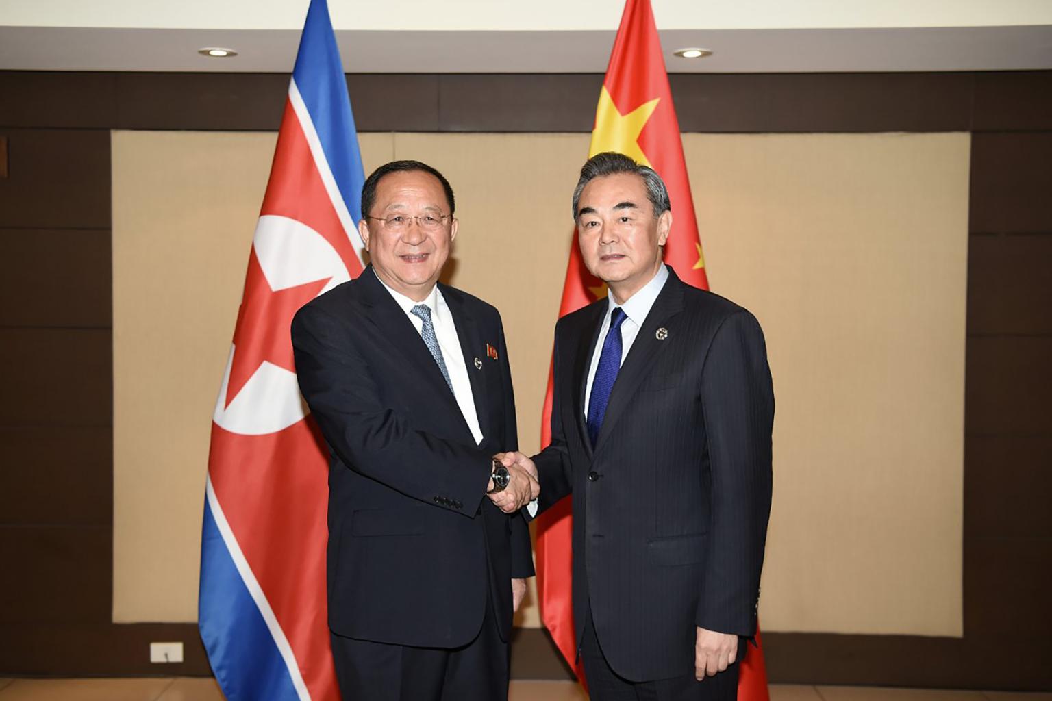 China's Foreign Minister Wang Yi (right) shakes hands with North Korea's Foreign Minister Ri Yong Ho (left) during their bilateral meeting on the sidelines of the Association of Southeast Asian Nations (ASEAN) regional security forum in Manila on Aug 6, 2017.