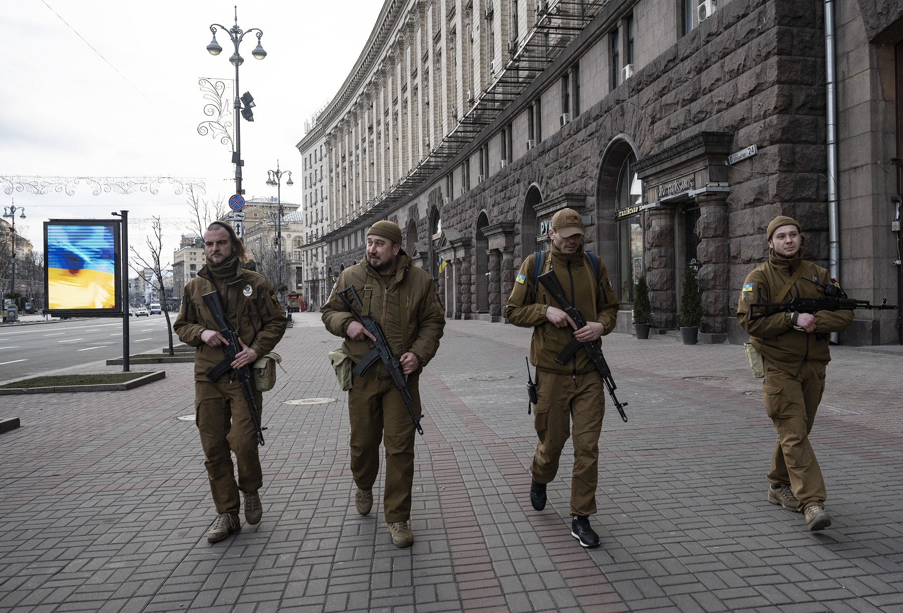 Ukrainian volunteer fighters patrol in central Kyiv, on Feb. 25, 2022.