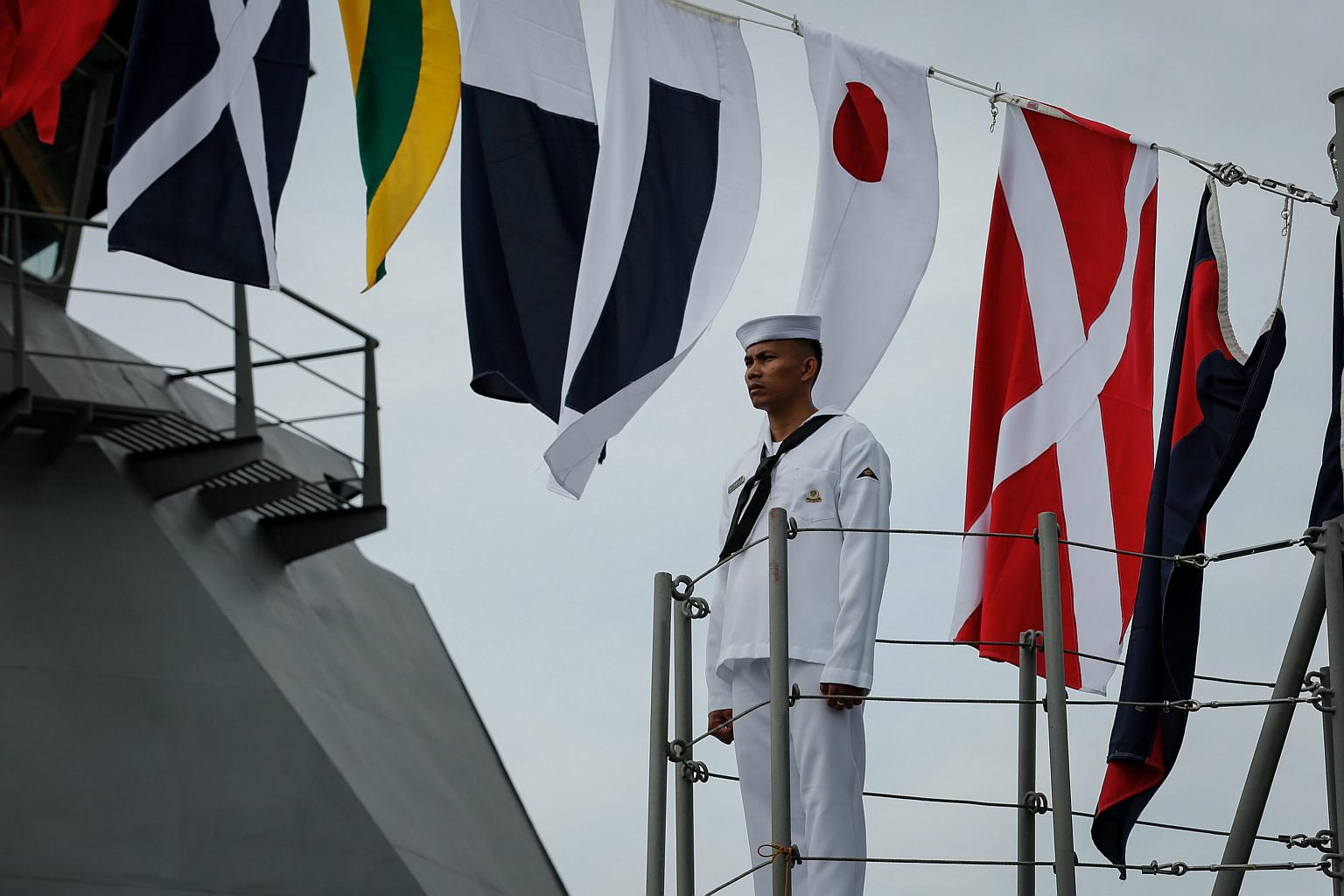 A Filipino navy personnel standing onboard a ship during the Philippine Navy's 118th anniversary at a port in Manila on June 1.