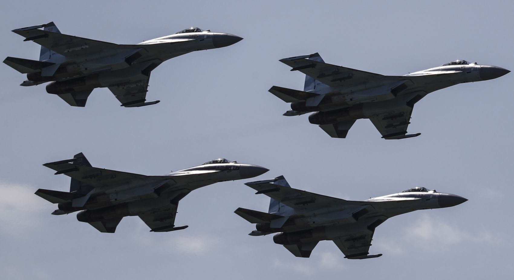 The Russian Air Force's aerobatics team flying with Sukhoi SU-35 aircraft during an air show in, Zhukovsky, on July 17, 2017. China purchased 10 SU-35 combat aircraft in 2017.