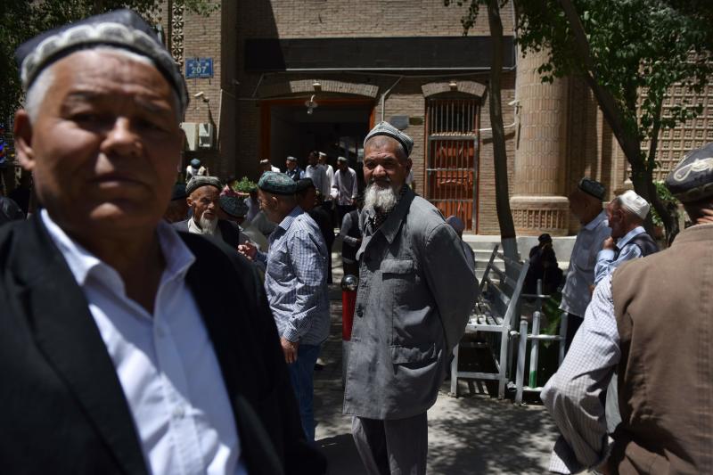 In a photo taken on May 31, Uighur men leave a mosque after prayers in Hotan in China's Xinjiang region.