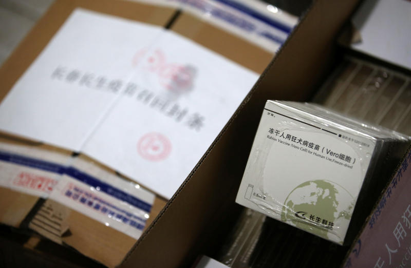 A box of vials containing the rabies vaccine manufactured by vaccine maker Changsheng Biotechnology is seen next to a sealed package of the same vaccines to be recalled at a local disease prevention and control centre in Huangshan, China, on July 23, 2018.