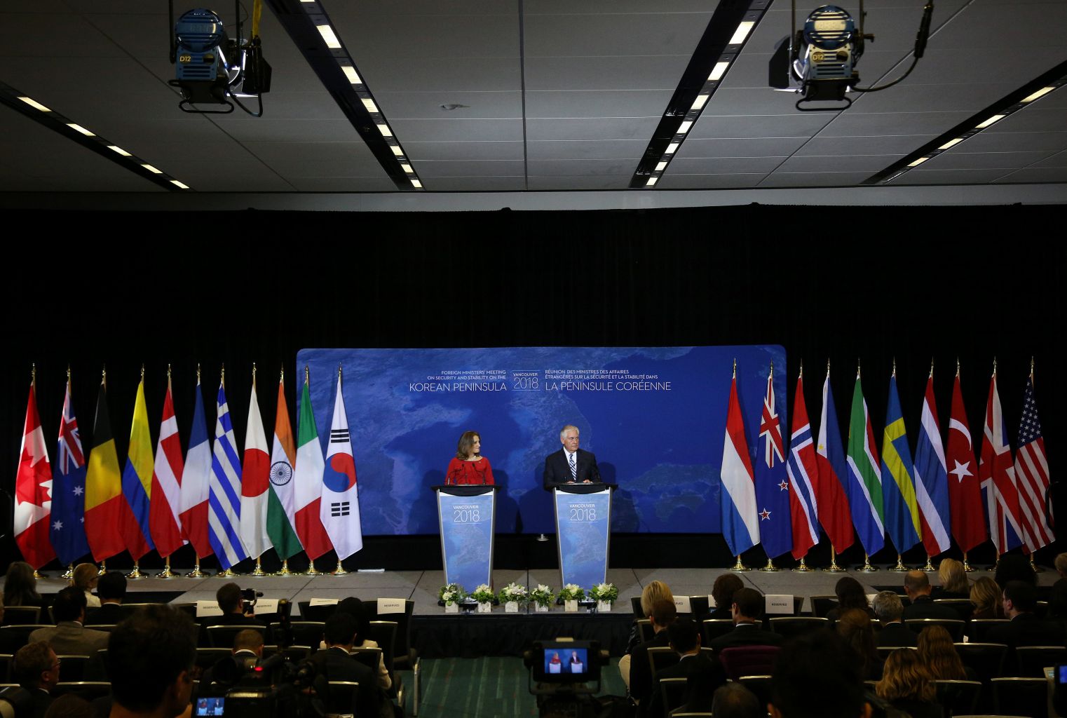 US Secretary of State Rex Tillerson (right) and Canada Foreign Minister Chrystia Freeland speaking at a news conference in Vancouver on Jan 16, 2018.