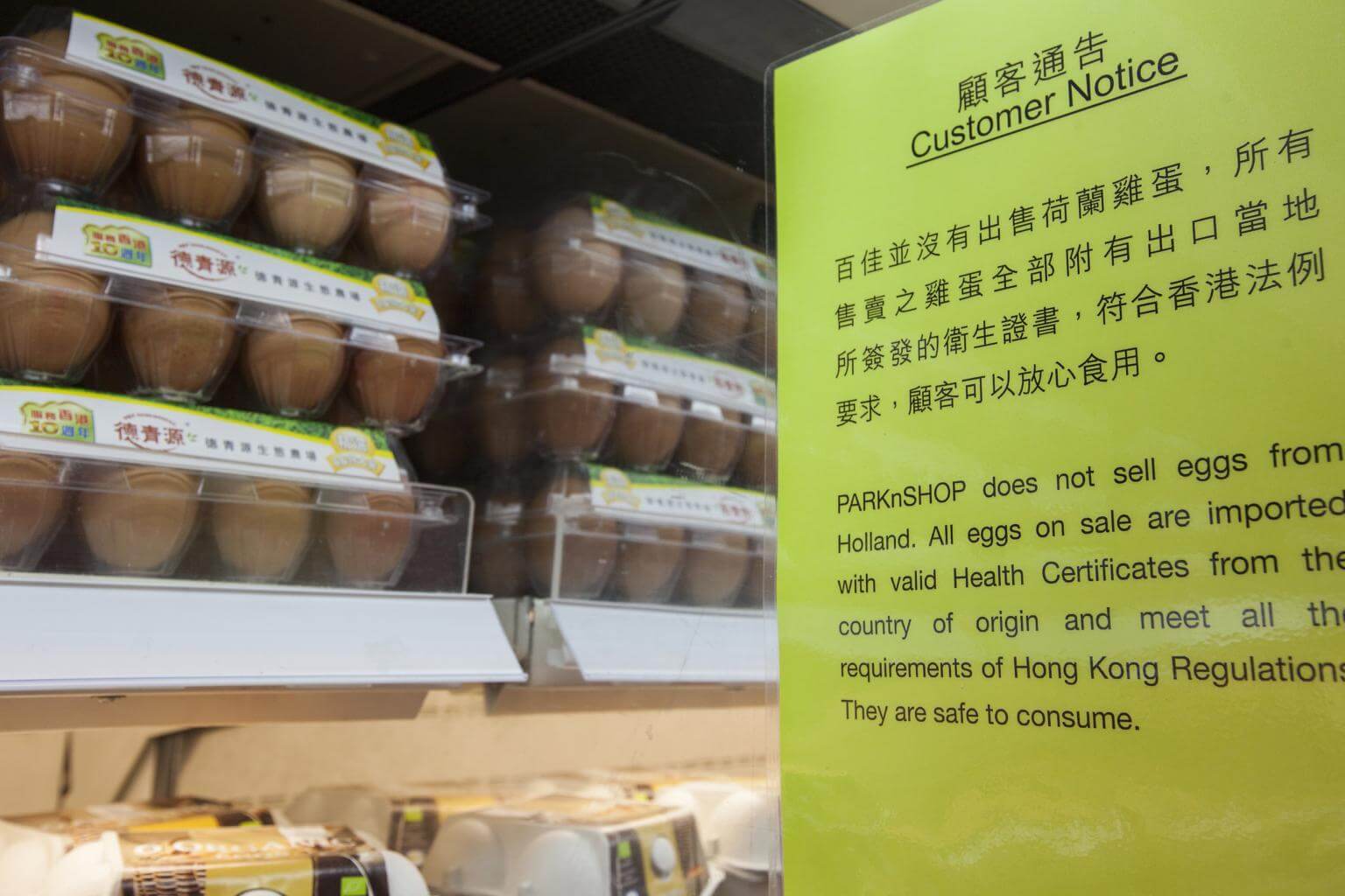 A customer notice advising that eggs for sale in a supermarket in Hong Kong are safe for consumption, on Aug 12, 2017.