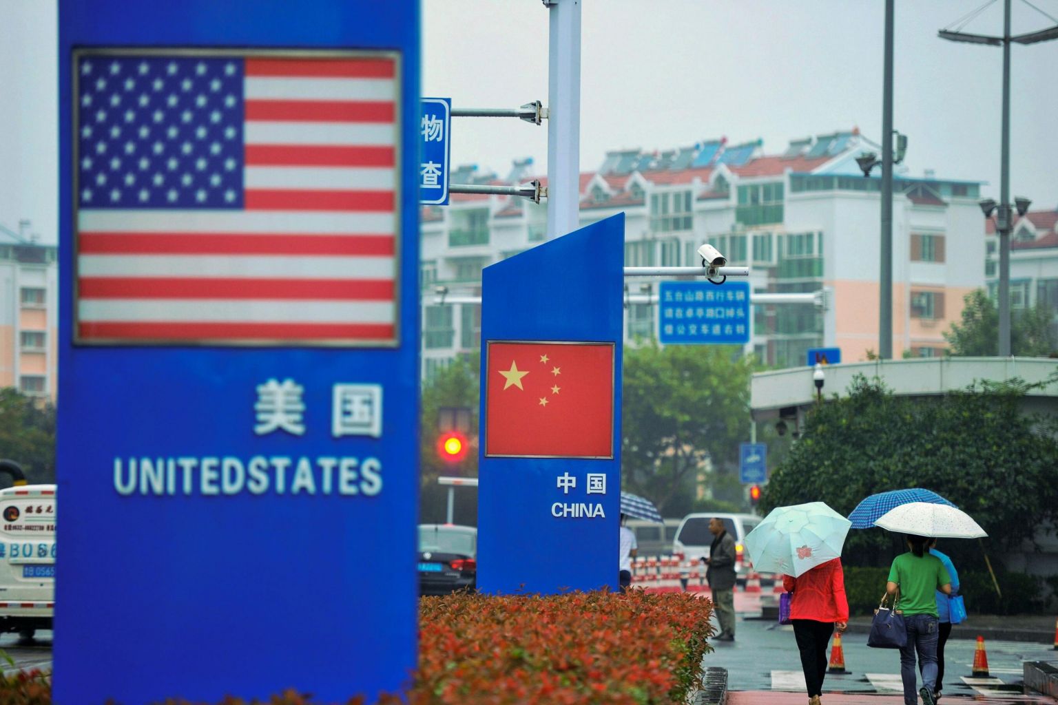 Signs with the US flag and Chinese flag are seen outside a store selling foreign goods in Qingdao, Shandong, on Sept 19, 2018.
