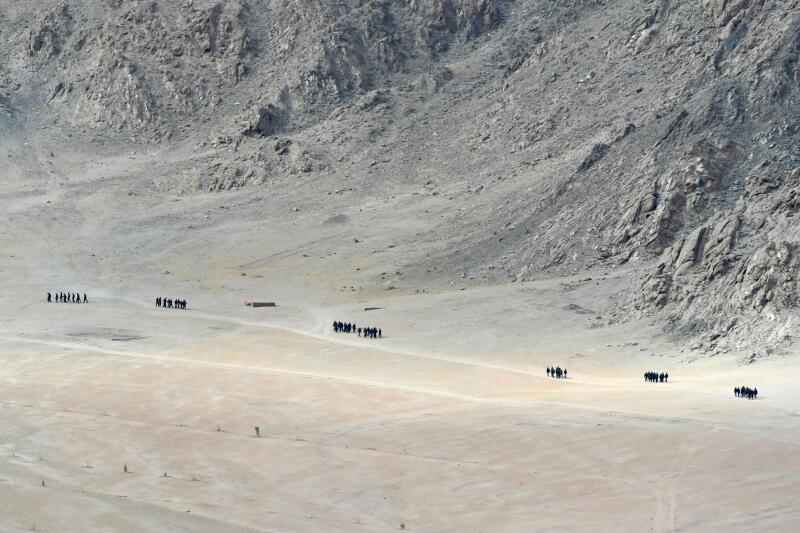 Indian soldiers walk at the foothills of a mountain range near Leh, Ladakh, on June 25, 2020.