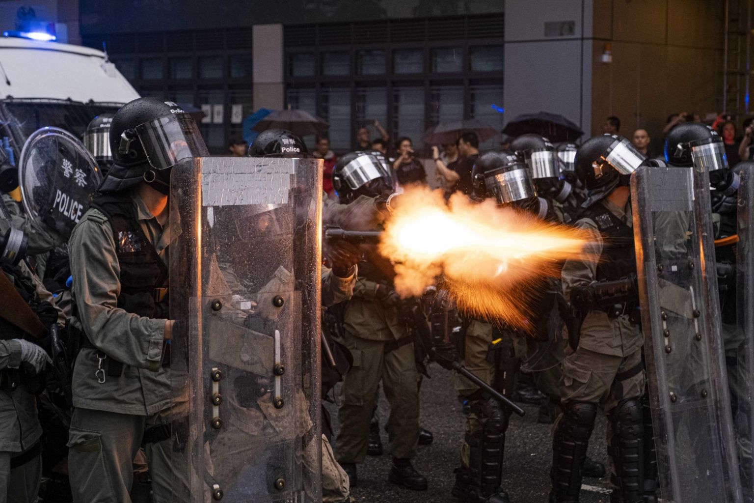 A police officer in riot gear fires tear gas at protesters during a clash in the Tsuen Wan district of Hong Kong, on Aug 25, 2019.