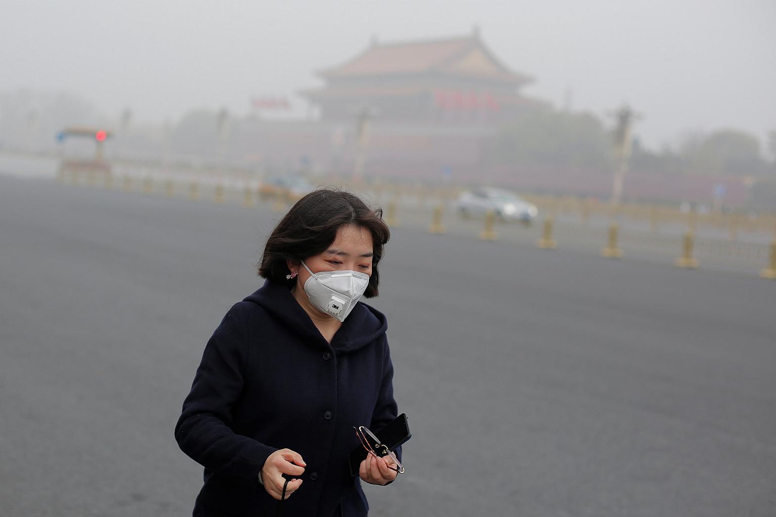 A woman wears a mask as Tiananmen Square is shrouded in haze after a yellow alert was issued for smog in Beijing, China, on Nov 14, 2018.