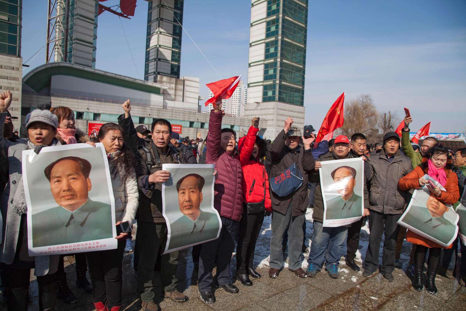 Chinese protesters carrying portraits of Mao Zedong calling for a boycott against South Korean products, in Jilin on March 5, 2017.