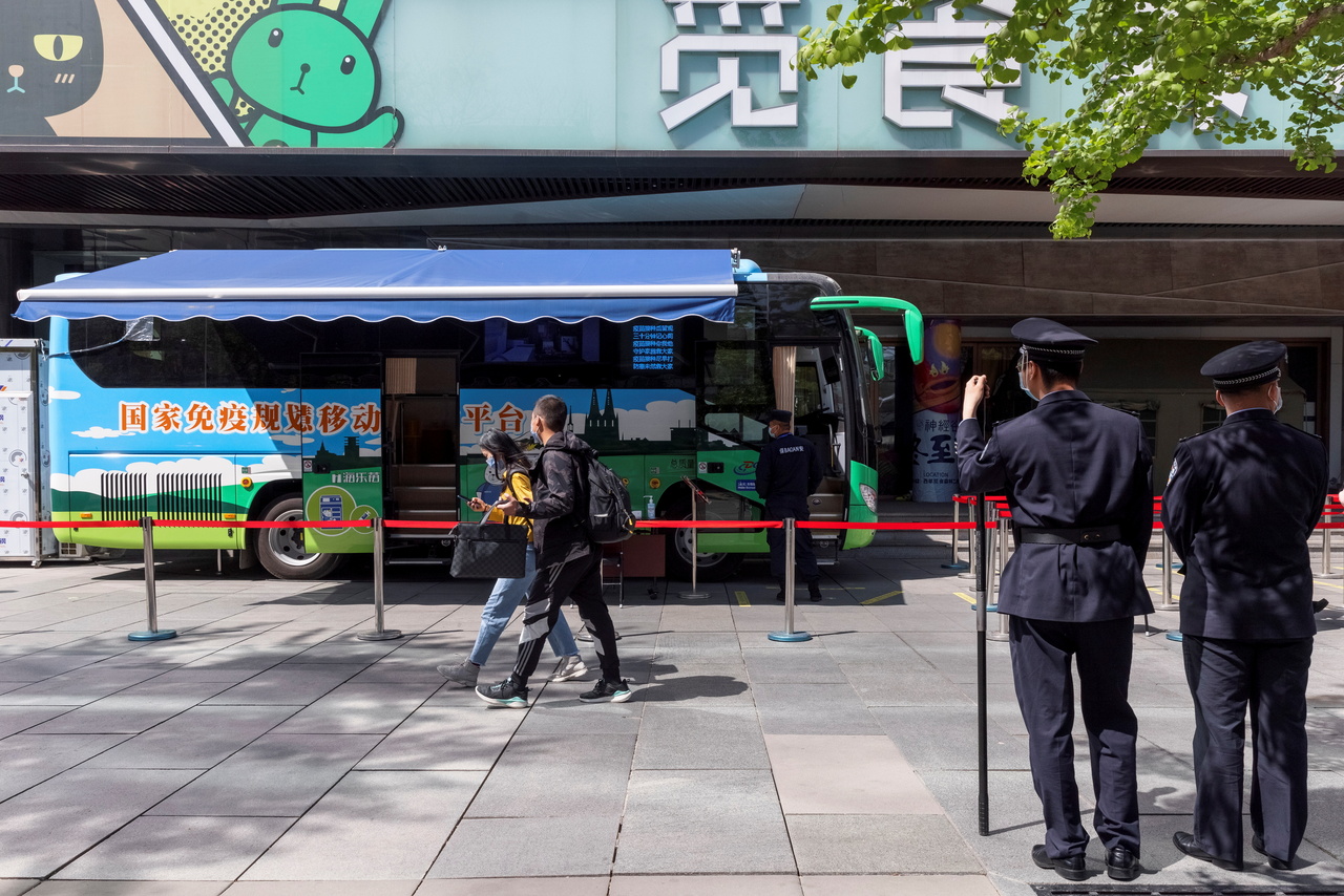 <p>Security members stand guard outside a coronavirus disease (COVID-19) mobile vaccination unit in Beijing, China, April 14, 2021. REUTERS/Thomas Peter</p>