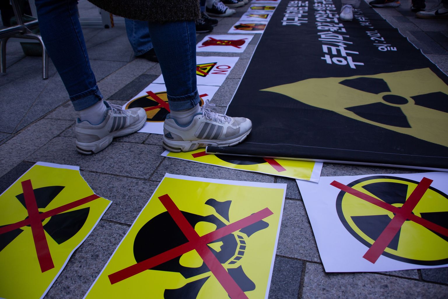 University students in South Korea protest against Japan's decision to release radioactive water into the ocean on April 14, 2021.