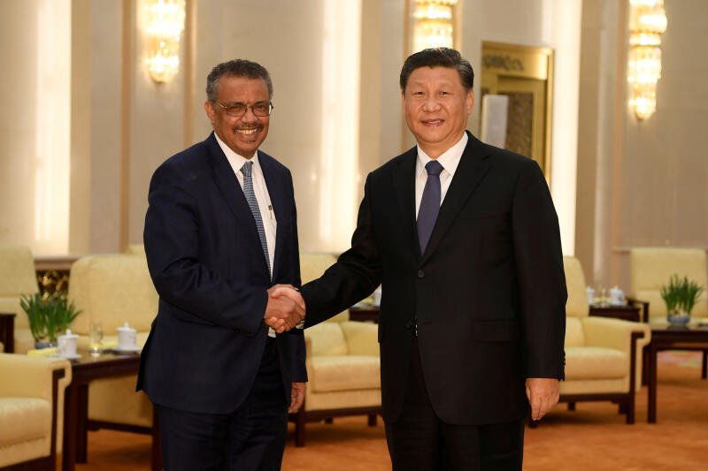 World Health Organisation director-general Tedros Adhanom Ghebreyesus with Chinese President Xi Jinping in Beijing on Jan 28, 2020.