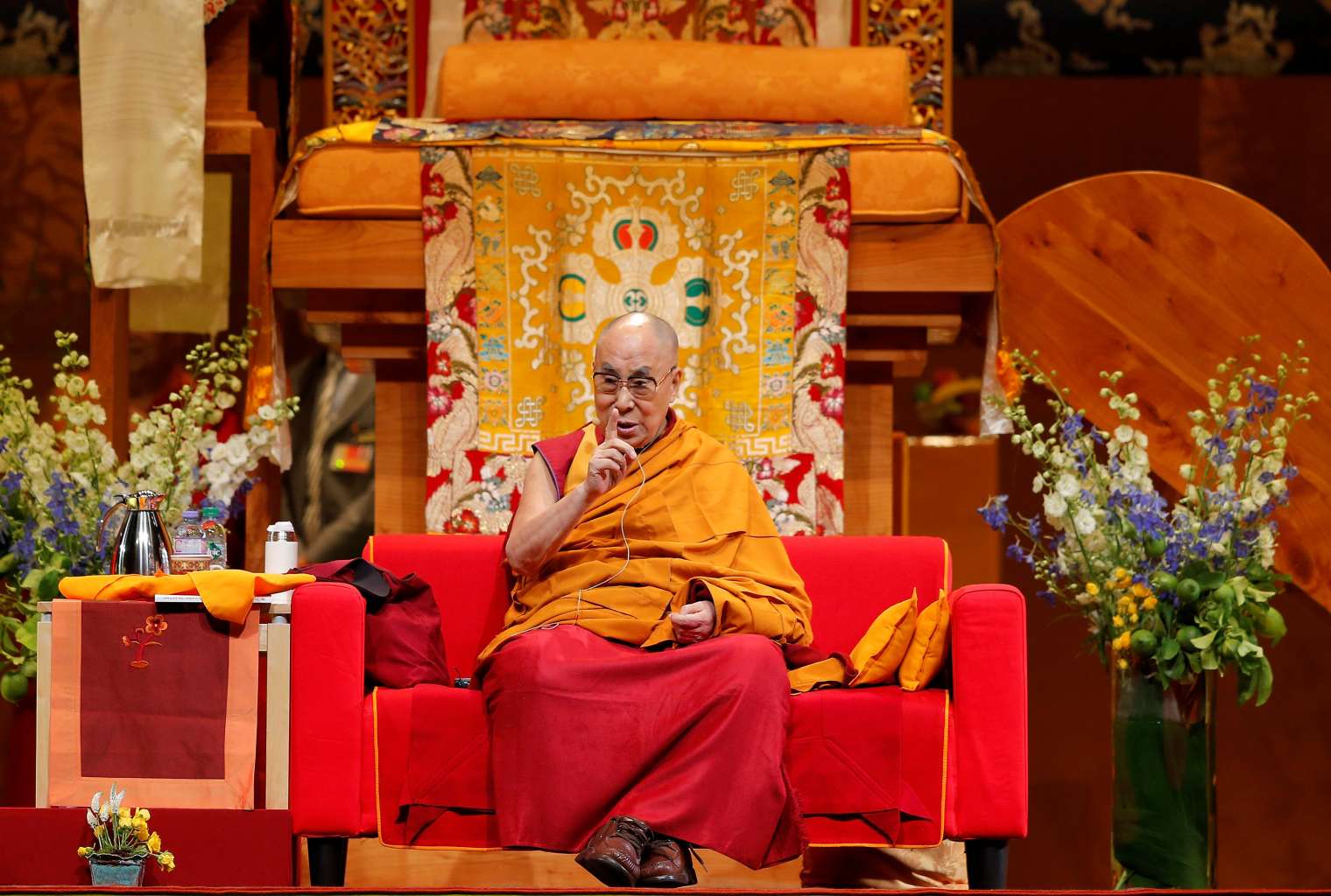 Tibet's exiled spiritual leader the Dalai Lama gestures as he gives a public religious lecture to the faithful in Strasbourg, France on Sept 17, 2016.